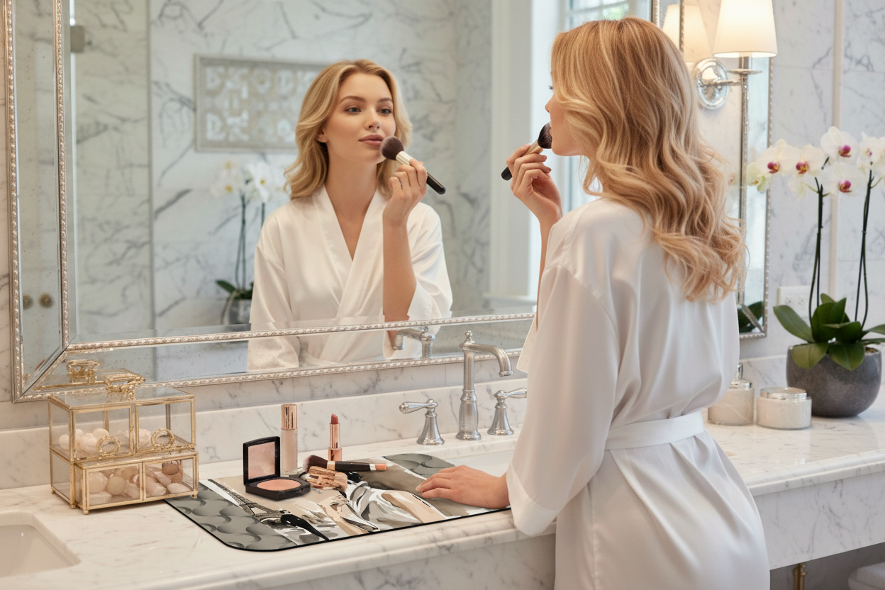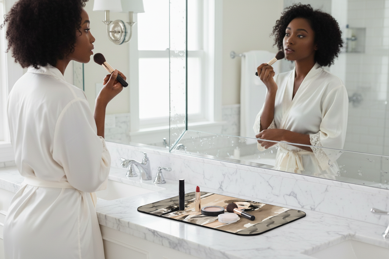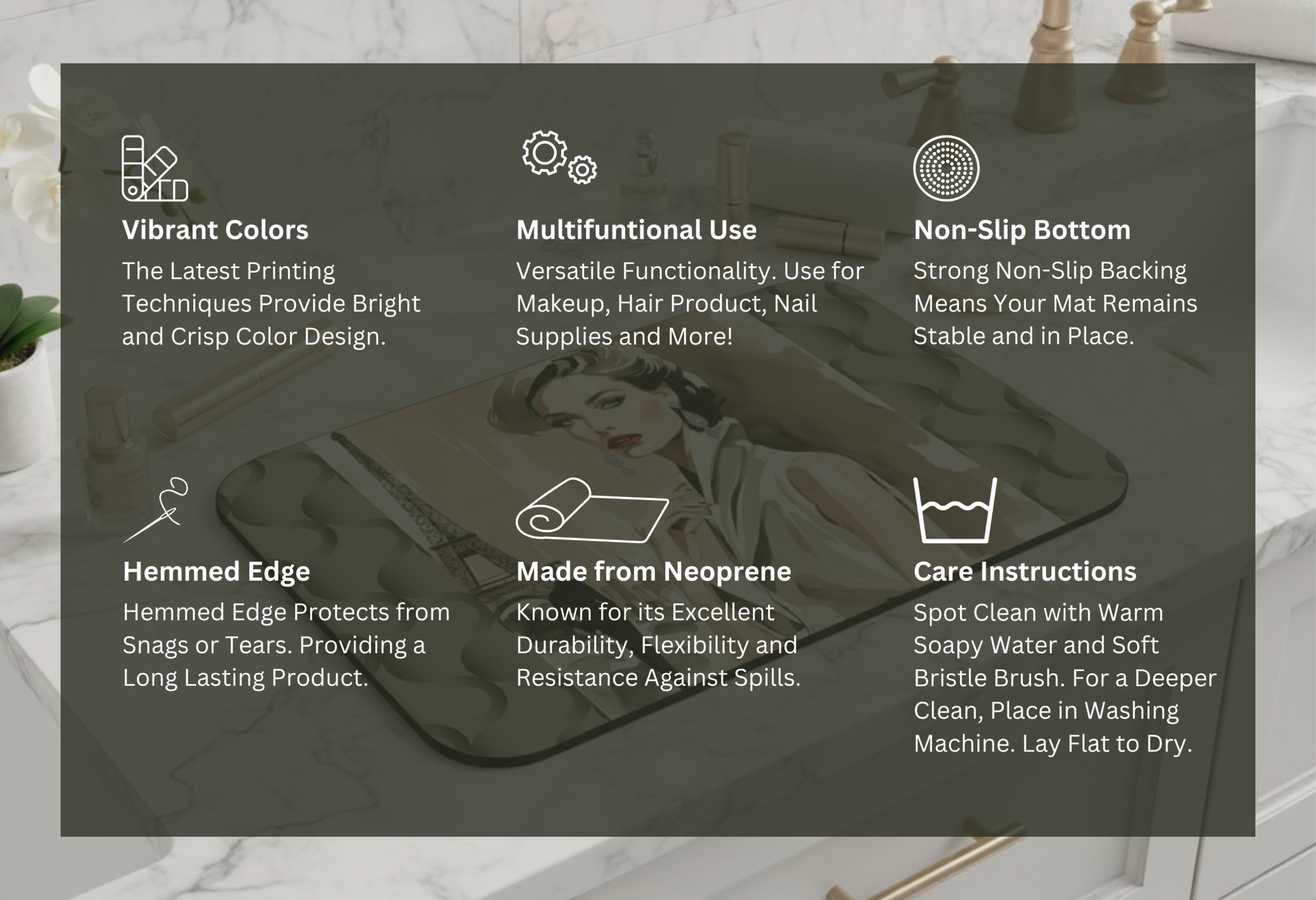 - Each mat is crafted from thick neoprene for durability, cushion, and easy maintenance — perfect for daily glam routines.
